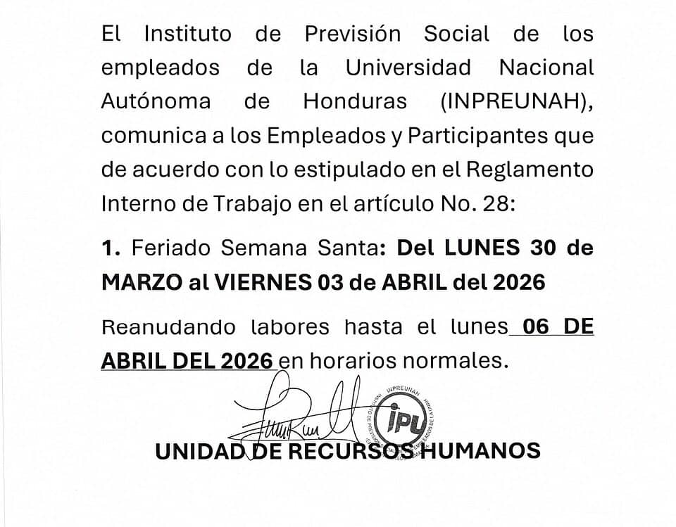 COMUNICADO INPREUNAH No.002/2026 El Instituto de Previsión Social de los Empleados de la Universidad Nacional Autónoma de Honduras (INPREUNAH), comunica a los Empleados y… COMUNICADO INPREUNAH